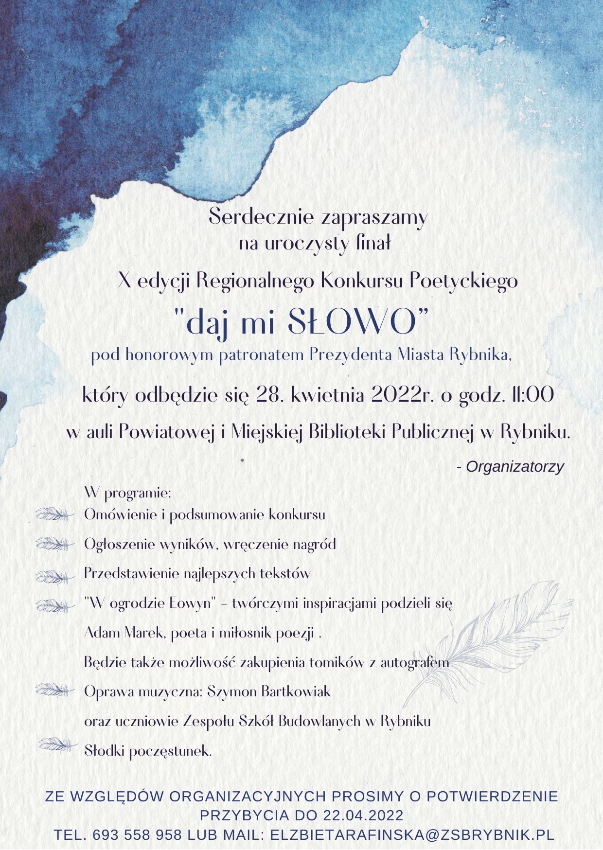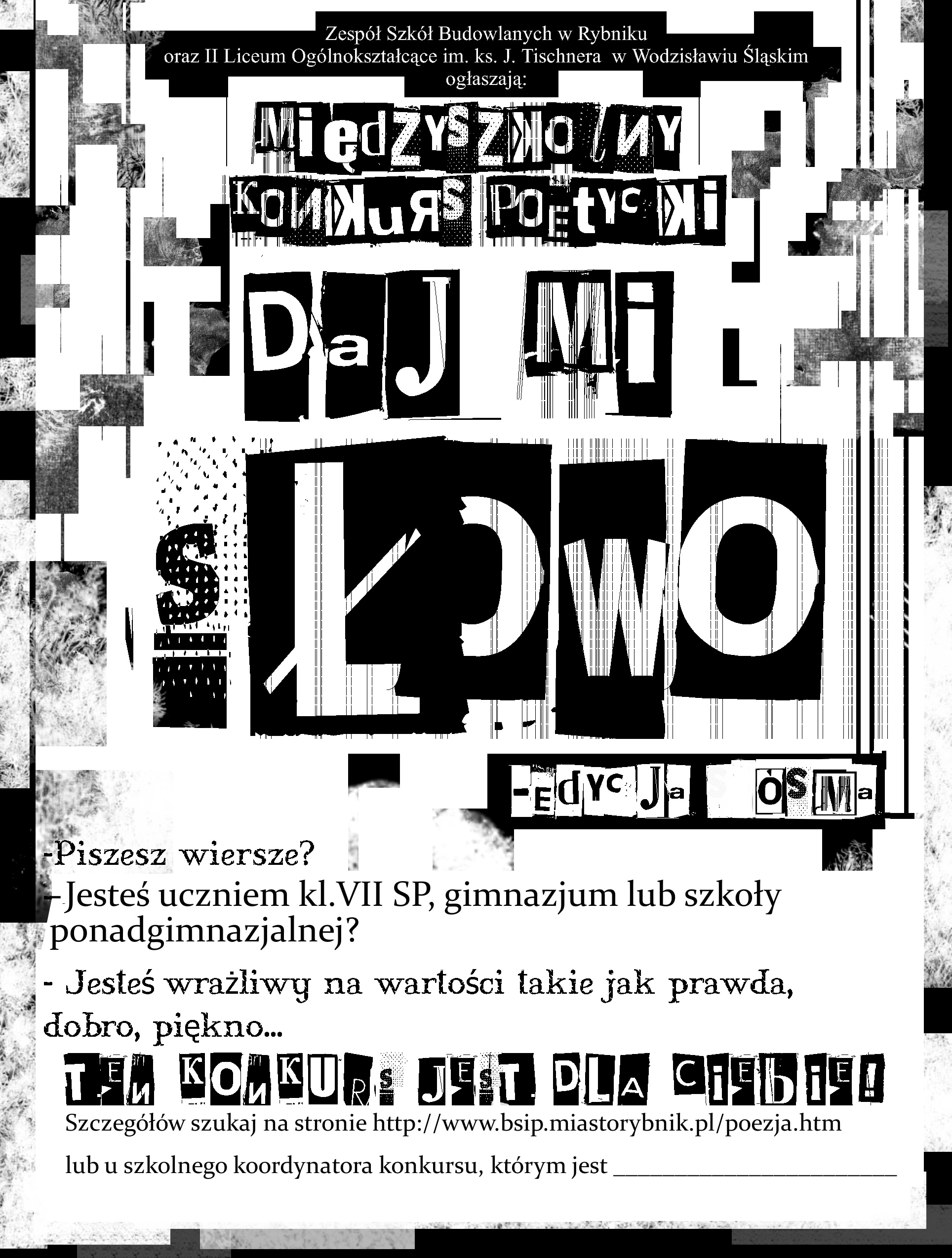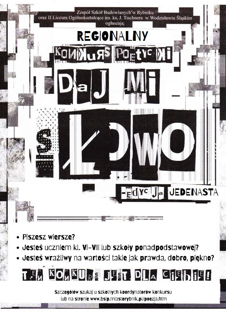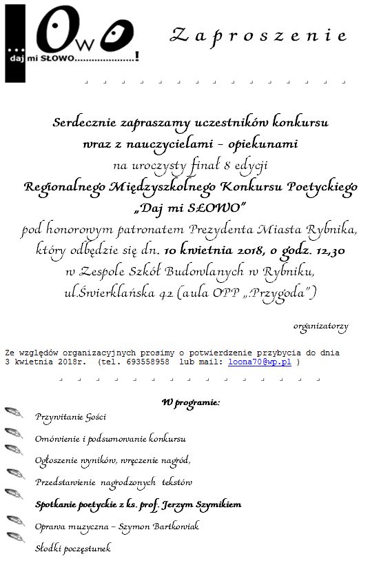 Serdecznie zapraszamy Uczniów Państwa Szkoły do wzięcia udziału w drugiej edycji Międzyszkolnego Konkursu Poetyckiego "daj mi SŁOWO"., nad którym honorowy patronat objął Prezydent Miasta Rybnika Adam Fudali.