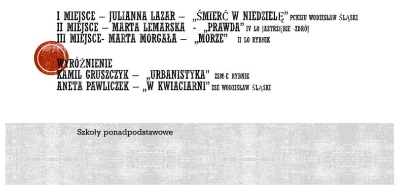 Za pojedyncze teksty wyróżnienia otrzymali: Zuzanna Zięba (I LO Wodzisław), Sebastian Brzezina (ZSME, Rybnik), Anna Suchecka, Karolina Kruczek, Marta Strzelczyk i Agnieszka Fiedor (I LO, Jastrzębie).